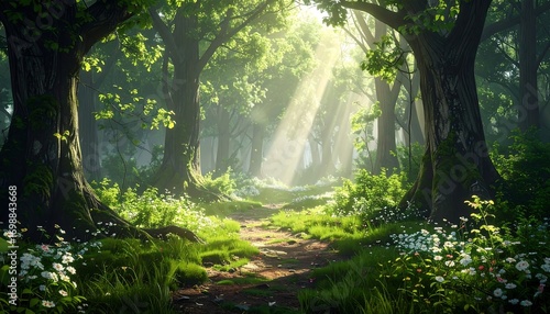 Obraz premium Sunlight path through a lush forest
