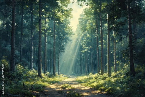 © mega, Fototapeta premium Sunlight path through a tranquil forest