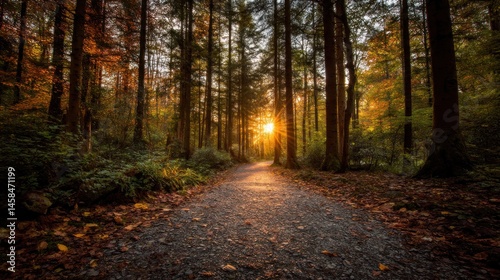 Fototapeta premium Sunlight path through autumn forest
