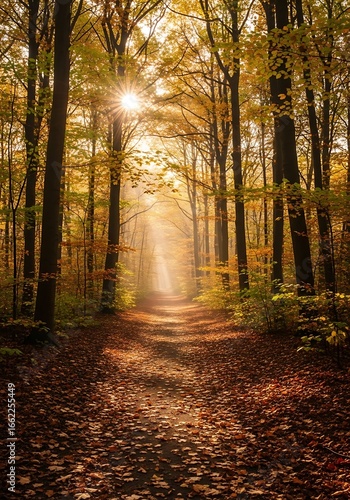 Naklejka premium Sunlight path through autumn forest