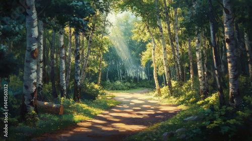 Fototapeta premium Sunlight path through birch trees (1)