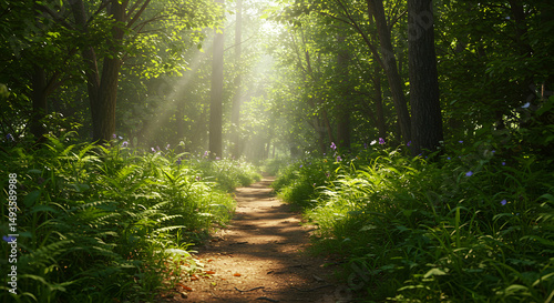 © LarisManis, Obraz premium Sunlight path through lush forest