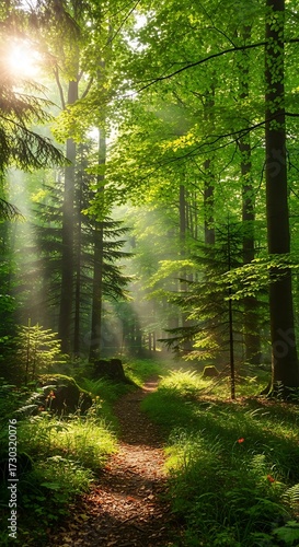 © sandi, Obraz premium Sunlight Path Through Lush Forest.
