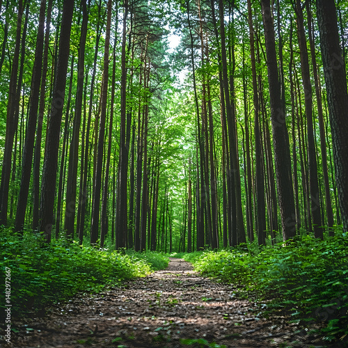 Obraz premium Sunlight Path Through Lush Pine Forest