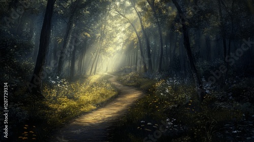 © marfuah, Naklejka premium Sunlight Path Through Misty Forest