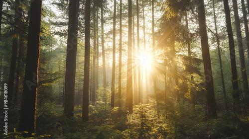 Fototapeta premium Sunlight peeking through tall trees in a forest.