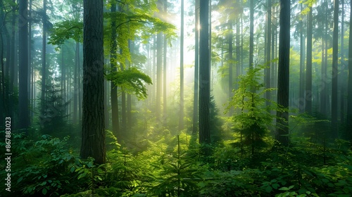 © Michal, Fototapeta premium Sunlight penetrating the forest, sun, forest, sun reflections, trees