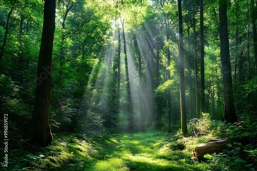 © Daryna Diakova, Obraz premium sunlight penetrating through the trees, green dense forest, relaxing environment