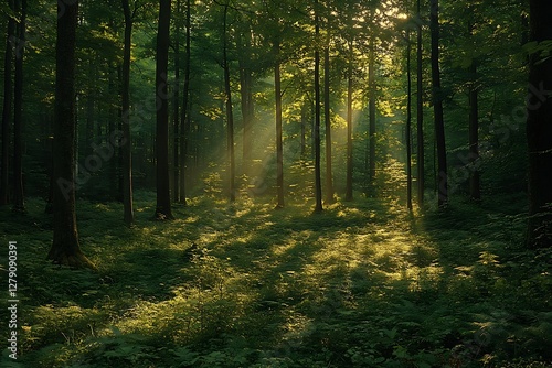 Naklejka premium Sunlight Pierces a Peaceful Forest Canopy
