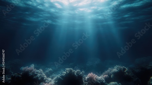 Obraz premium Sunlight pierces deep ocean, coral reefs