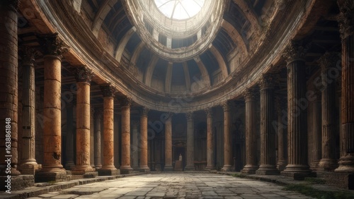 © and, Obraz premium Sunlight Pierces the Oculus of a Grand, Weathered Ancient Rotunda