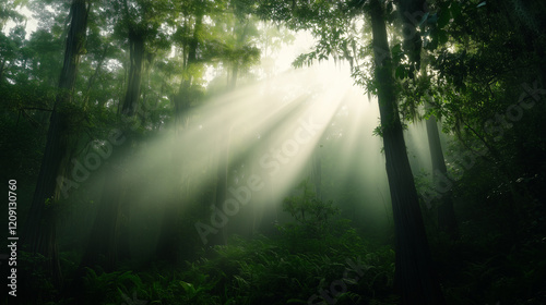 Obraz premium Sunlight pierces through lush green trees in tranquil forest, creating...