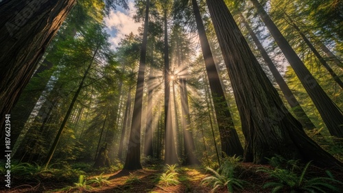 Obraz premium Sunlight pierces through tall trees in a lush forest