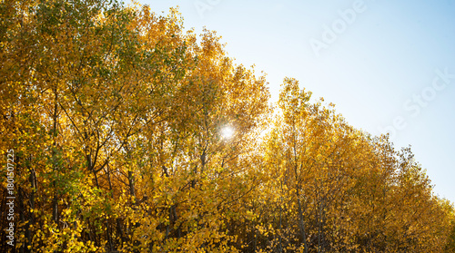 Fototapeta premium Sunlight pierces through the golden canopy of an autumn forest, casting a warm glow over the vibrant yellow leaves against a clear sky.