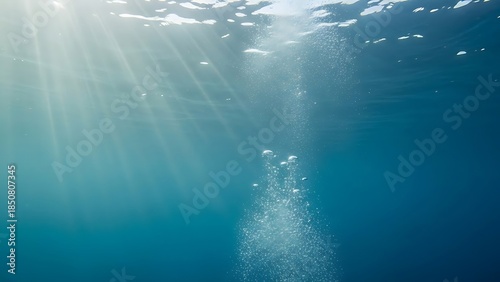 © Muhammad, Fototapeta premium Sunlight pierces through the tranquil blue ocean surface, illuminating a steady stream of rising effervescent bubbles in the clear, deep underwater environment