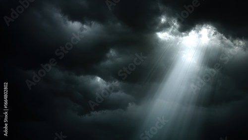Obraz premium Sunlight piercing a dark sky filled with clouds.