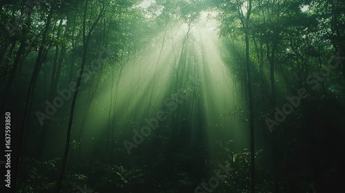 © Puri, Obraz premium Sunlight piercing a misty jungle