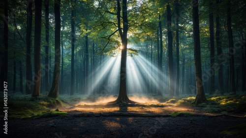 © ranary, Fototapeta premium Sunlight Piercing Dark Forest