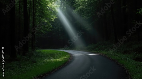 © tugkiara, Obraz premium Sunlight Piercing Dark Forest Road