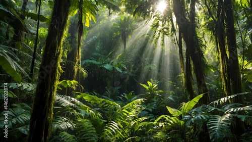 Obraz premium Sunlight Piercing Lush Tropical Rainforest Canopy