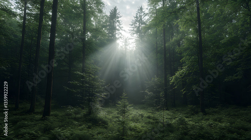 Obraz premium Sunlight piercing misty forest (1)