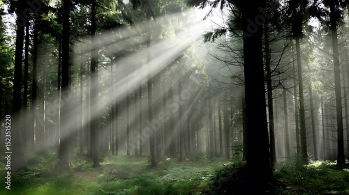 Obraz premium Sunlight piercing through a dense forest