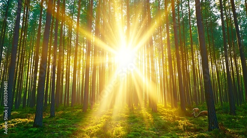 © Sumet, Fototapeta premium Sunlight Piercing Through Dense Forest Canopy, Illuminating Ground with Natural Glow and Serenity