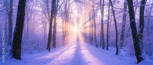 Naklejka premium Sunlight Piercing Through Snow-Covered Forest