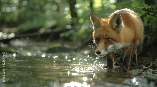 © 2D_Jungle, Fototapeta premium Sunlight piercing through the forest canopy, casting a serene light on a fox drinking from a clear, bubbling brook