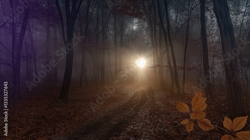 © Gen, Obraz premium Sunlight Piercing Through the Misty Forest Illuminating a Pathway Amidst Tall Trees and Fallen