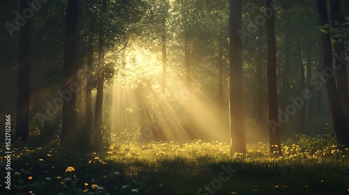 Fototapeta premium Sunlight piercing through trees, illuminating a flower-filled forest glade
