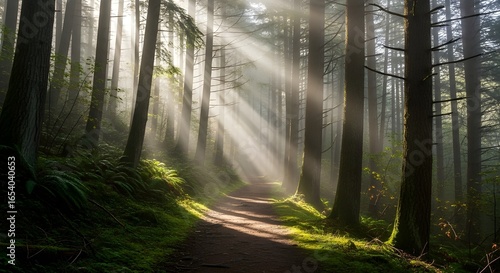 Obraz premium sunlight rays forest path morning