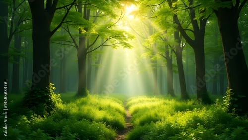 Obraz premium Sunlight Rays in Green Forest Landscape