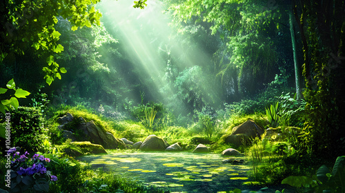 © popofyear, Obraz premium Sunlight rays pierce through the misty forest, illuminating the vibrant green foliage