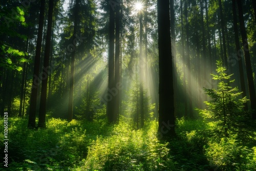 Obraz premium Sunlight Rays Piercing Through Dense Forest Canopy