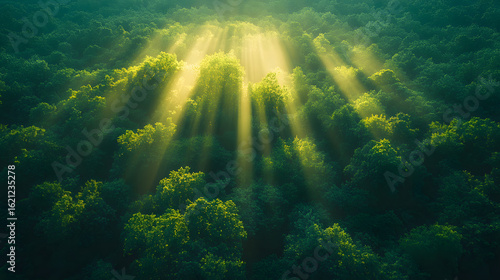 Fototapeta premium Sunlight Rays Shining Through Dense Forest Canopy