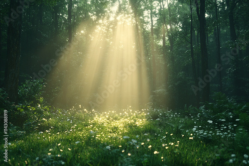 Obraz premium Sunlight Rays Streaming Through Forest Trees onto a Green Meadow