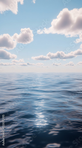 © Michael, Obraz premium Sunlight reflecting on a calm ocean, creating gentle waves beneath a blue sky dotted with fluffy white clouds, evokes tranquility and peace