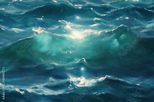 Fototapeta premium Sunlight reflecting on the surface of teal and deep blue ocean waves creating...
