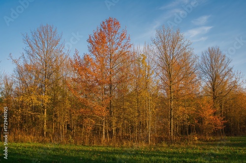 Fototapeta premium Sunlight shines on a woodland filled with towering trees and lush grass in...