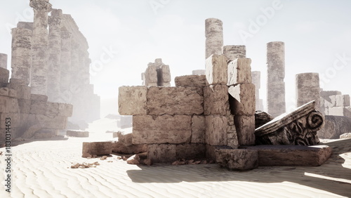 © icetray, Fototapeta premium Sunlight shines on the remnants of an ancient civilization in a sandy desert. Crumbling stone structures and columns hint at a rich history waiting to be explored by curious adventurers.