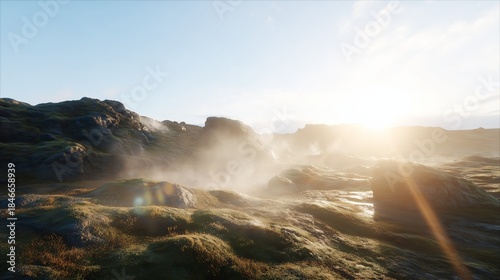 © fotofabrika, Fototapeta premium Sunlight shines over rocky landscape with mist rising in the early morning