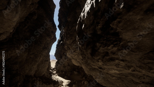 Naklejka premium Sunlight shines through a narrow canyon, with towering rock formations on...