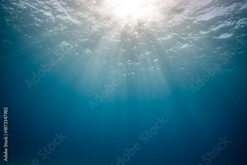 © Subphoto, Fototapeta premium Sunlight shines through water in the Red Sea near coral reefs