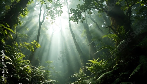 © Morits Art, Fototapeta premium Sunlight Shining Through Dense Forest Canopy with Ferns and Trees