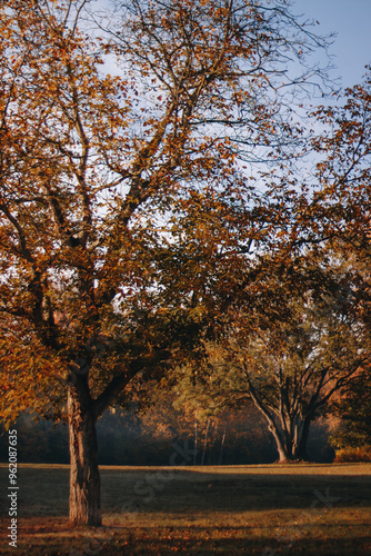 © alenagurenchuk, Fototapeta premium Sunlight shining through fall foliage on trees in a meadow