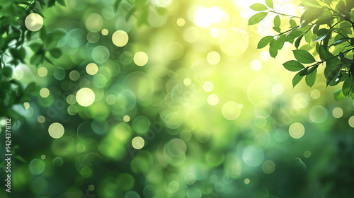 Obraz premium Sunlight shining through fresh green leaves creating a natural abstract bokeh...