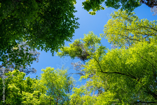 © Sandeep, Obraz premium Sunlight shining through green leaves
