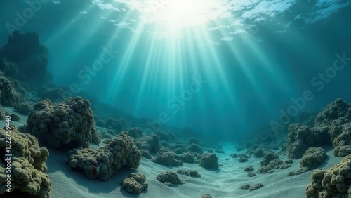 © Xavi, Fototapeta premium Sunlight shining through ocean water over a damaged and bleached coral reef
