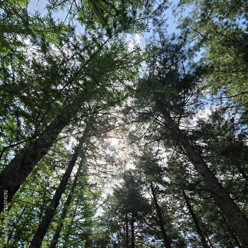 © 형준 주, Obraz premium Sunlight shining through tall forest trees